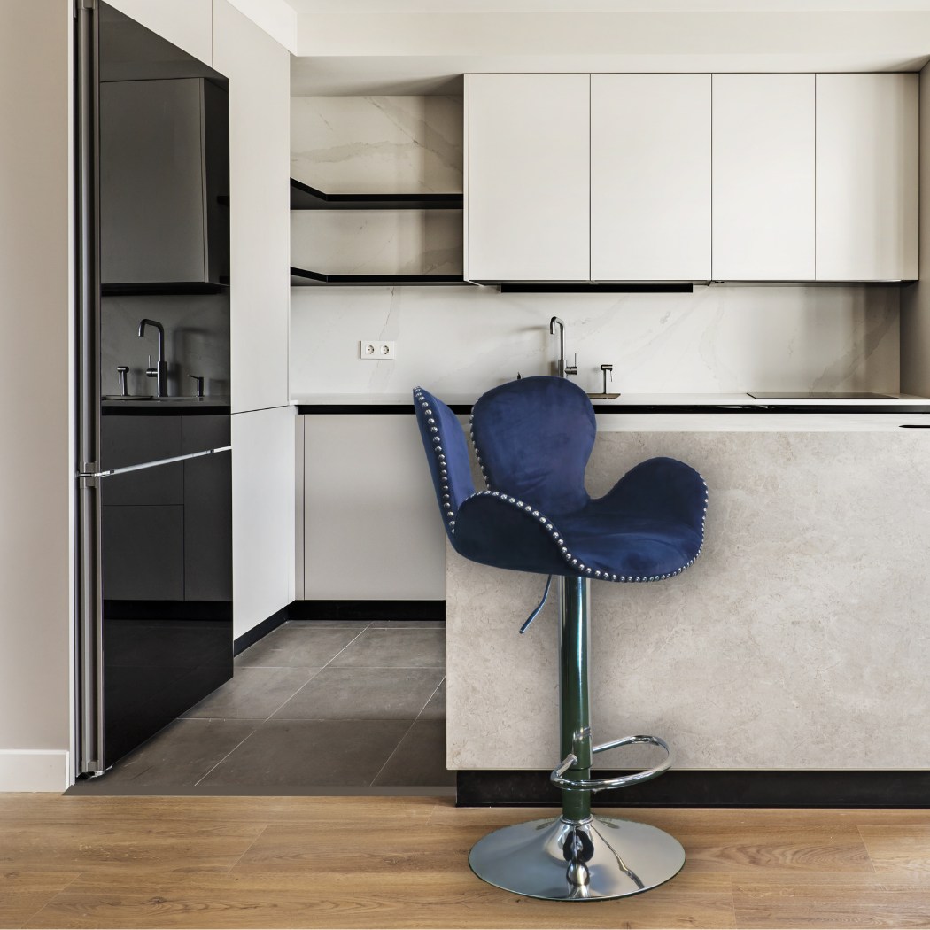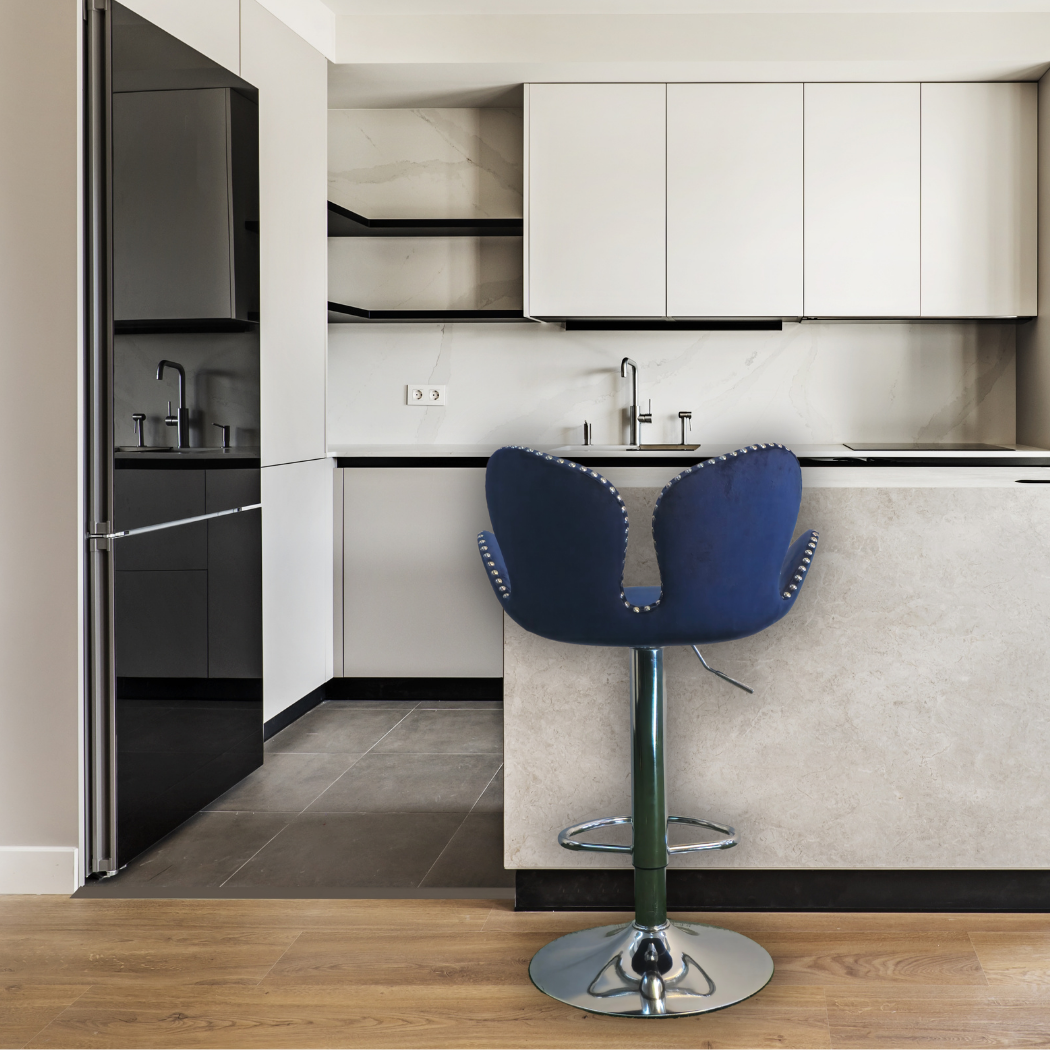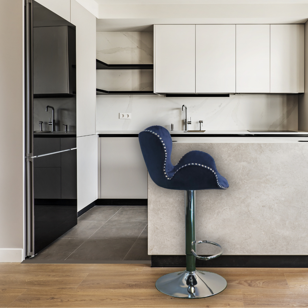 Royal blue, height adjustable, clover shape with silver stones around edges and silver pole leg with foot rest