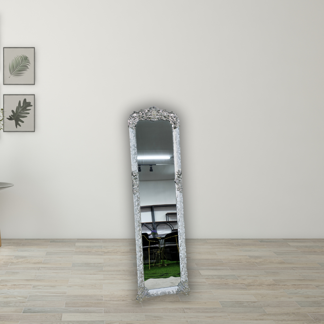 Long, rectangular mirror with a silver flower pattern printed on the sides and silver flower details on top, on the sides - in the middle & on the sides - at the bottom.
